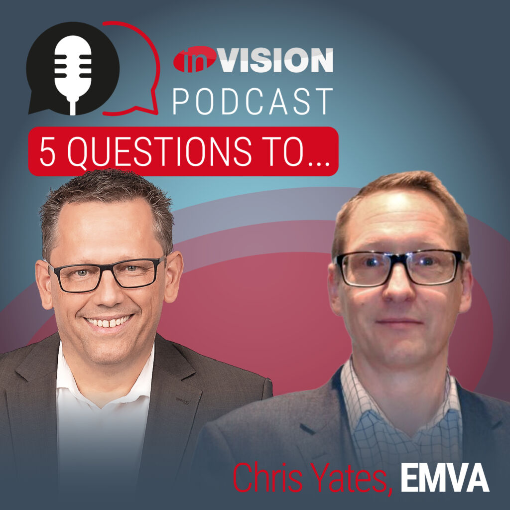 We talk about these topics in the first epsiode of our podcast ‘Five Questions to…’ with Dr. Chris Yates, President of theEMVA (European Machine Vision Association) and partner at Vision Ventures. Furthermore, we will talk with him about the big trends at Vision 2024, which new products he is particularly looking for and why vision standards are so important for the industry. At last we have a short look at the European Machine Vision Forum in Mulhouse (France).
