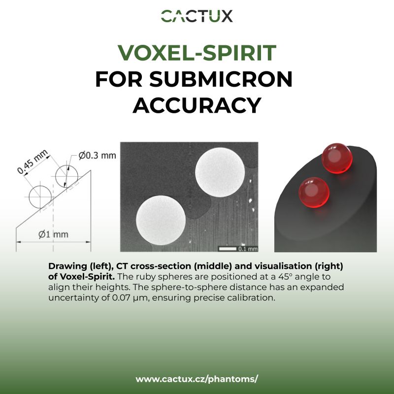One of the CactuX product lines, calibration Phantoms, strives to push the boundaries of precision in industrial CT. In collaboration with Ctlab Ceitec and RWTH Aachen, the latest research focuses on scale correction in submicron CT. The Voxel-Spirit calibration phantom played a key role in this study, addressing challenges in submicron CT where traditional calibration tools fall short. Designed for extreme precision, the phantom’s calibrated ruby spheres enabled users to correct scaling errors, improving accuracy from 3.35µm to just 0.26µm and reducing measurement uncertainty significantly.